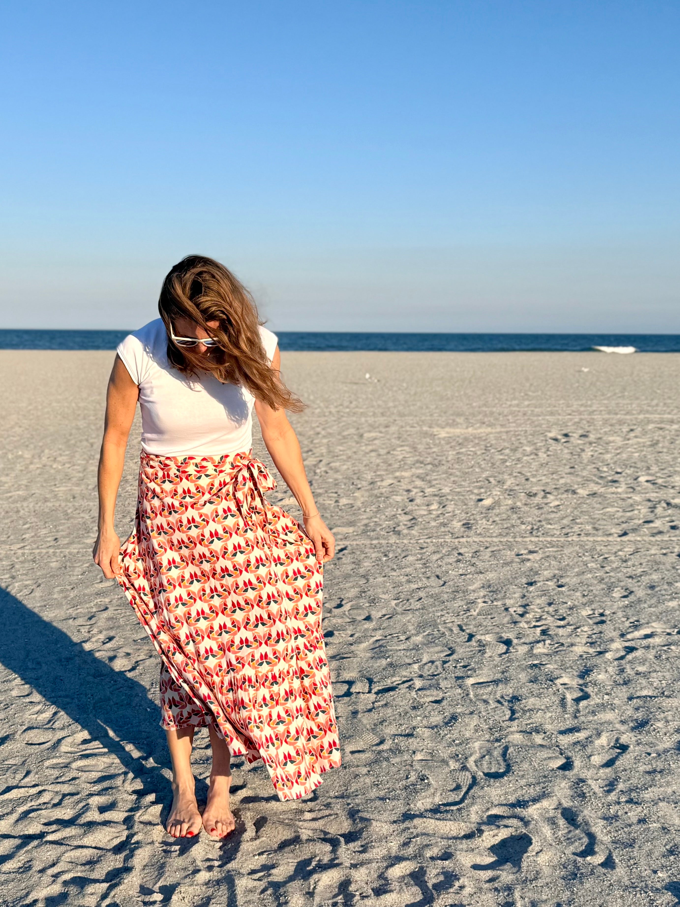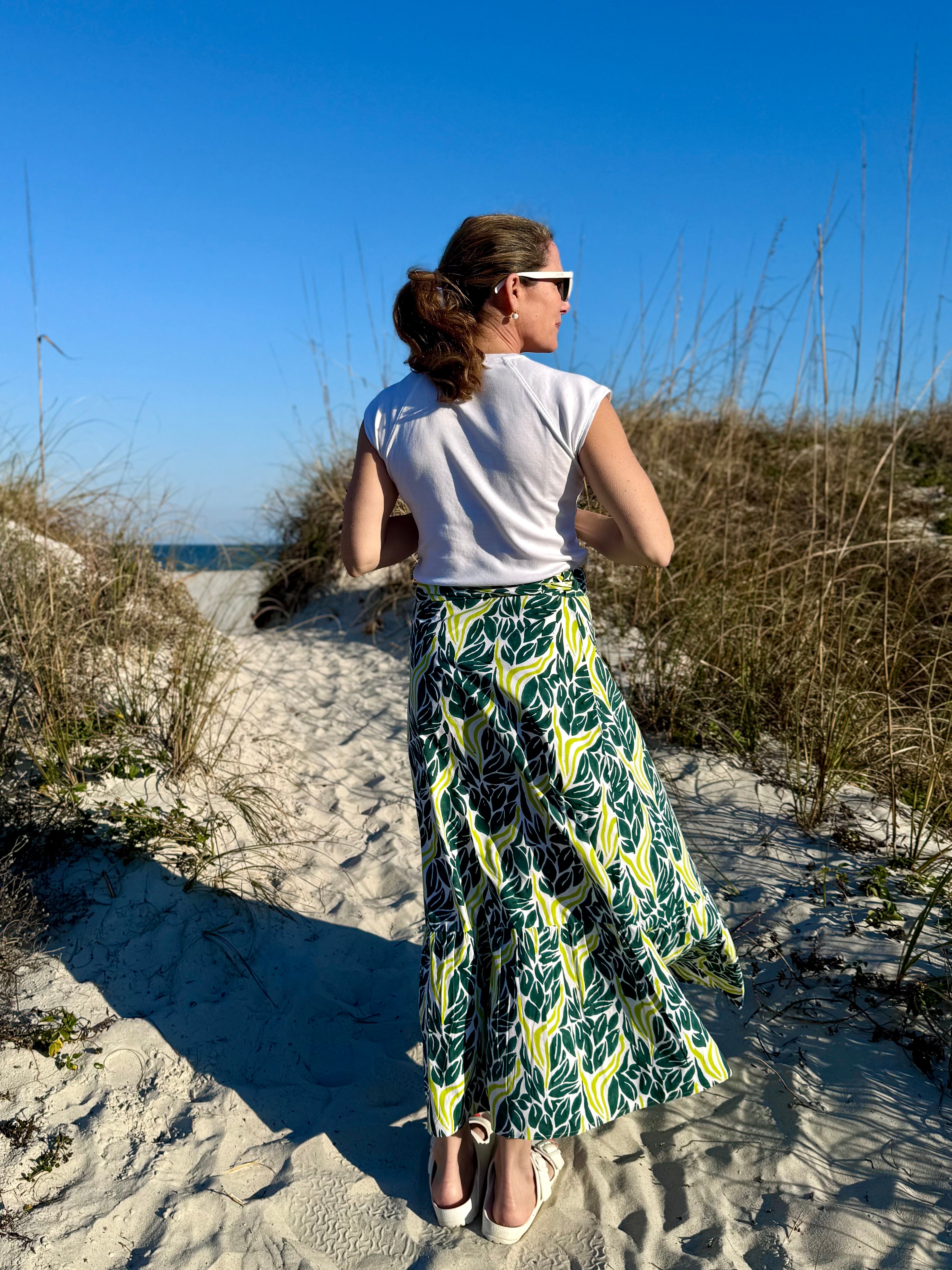 Our Midi and Maxi Ruffle Wrap Skirts are super chic, really girlie, casual but elegant, and extremely comfortable. The one-size-fits-most wrap style works for all shapes and sizes. The organic cotton was hand block printed using nontoxic dyes by a group of amazing artisans in Jaipur, India. We employ ethical, green practices that are kind to workers and the environment. Trust us, you will love these skirts and wear them all year long!